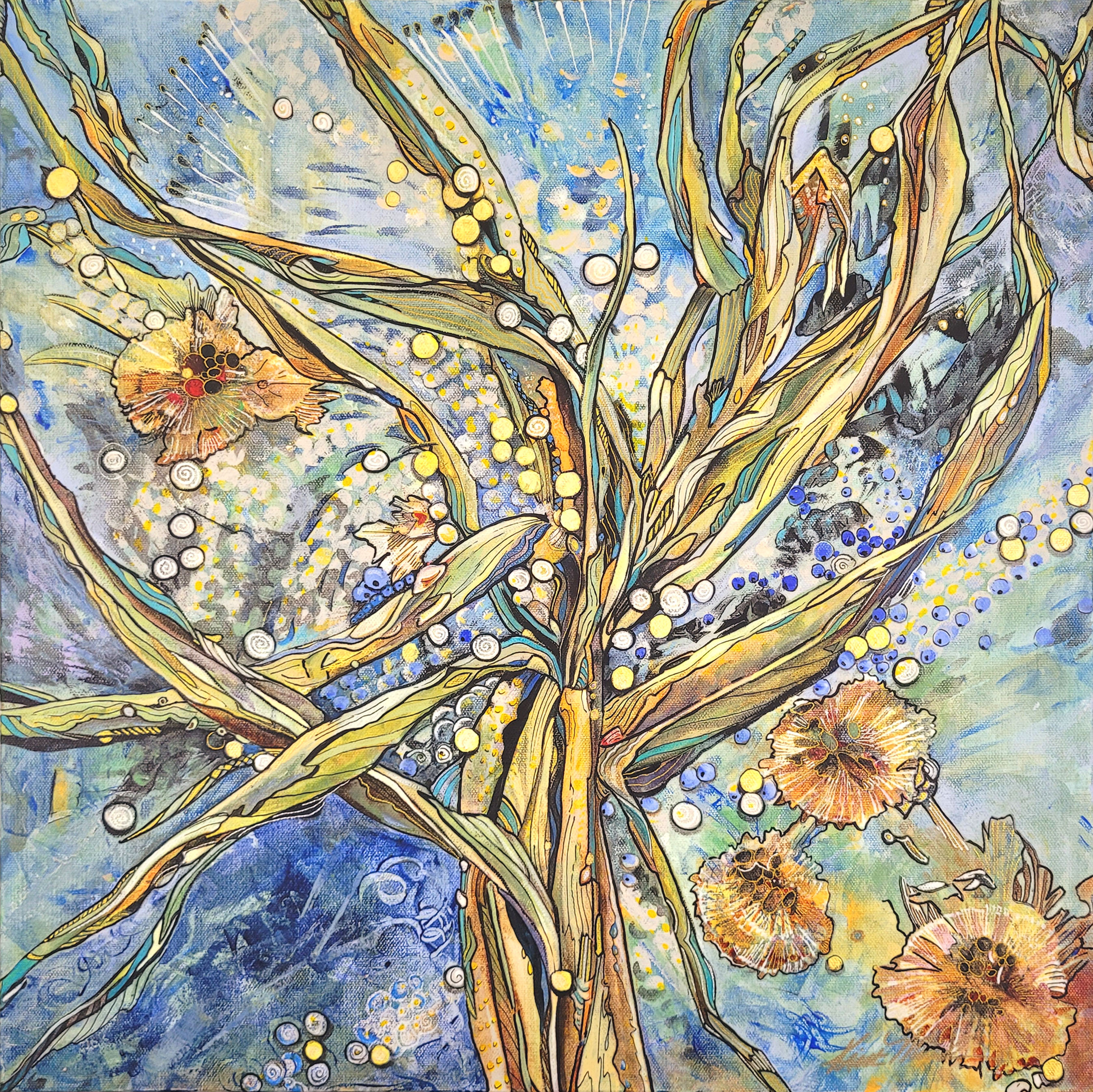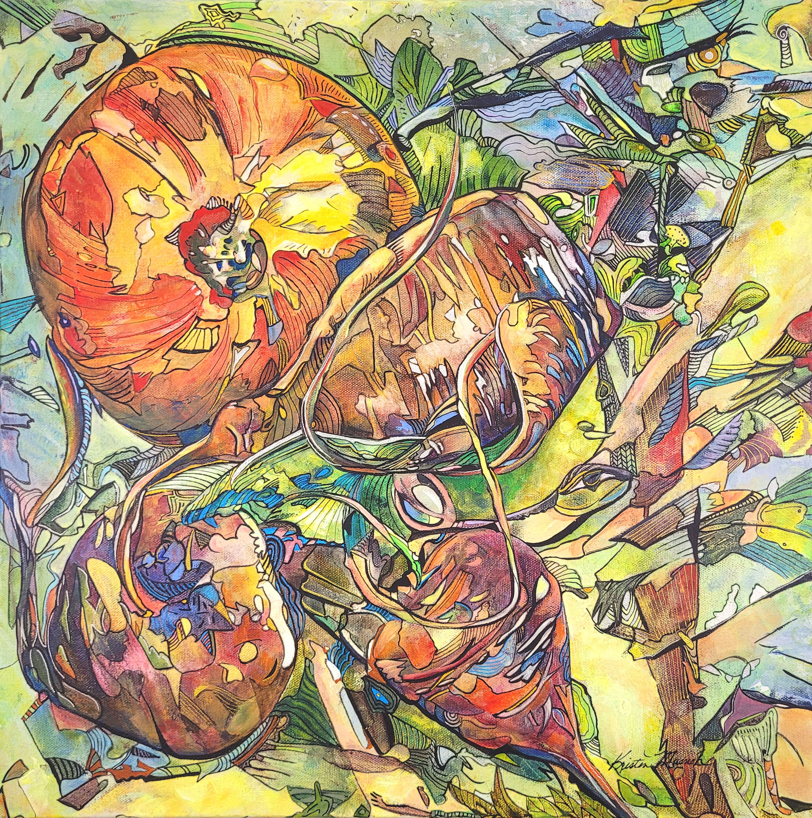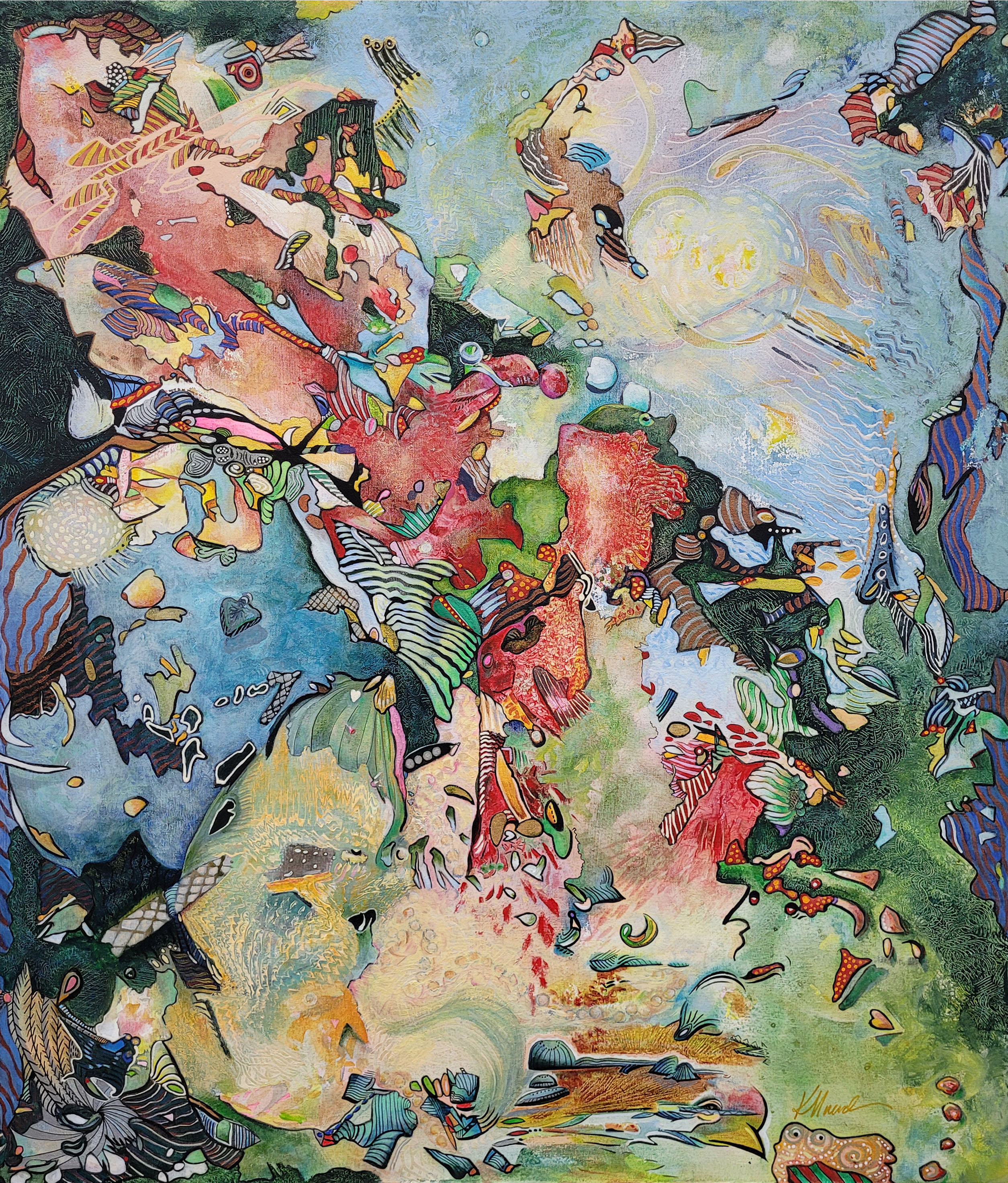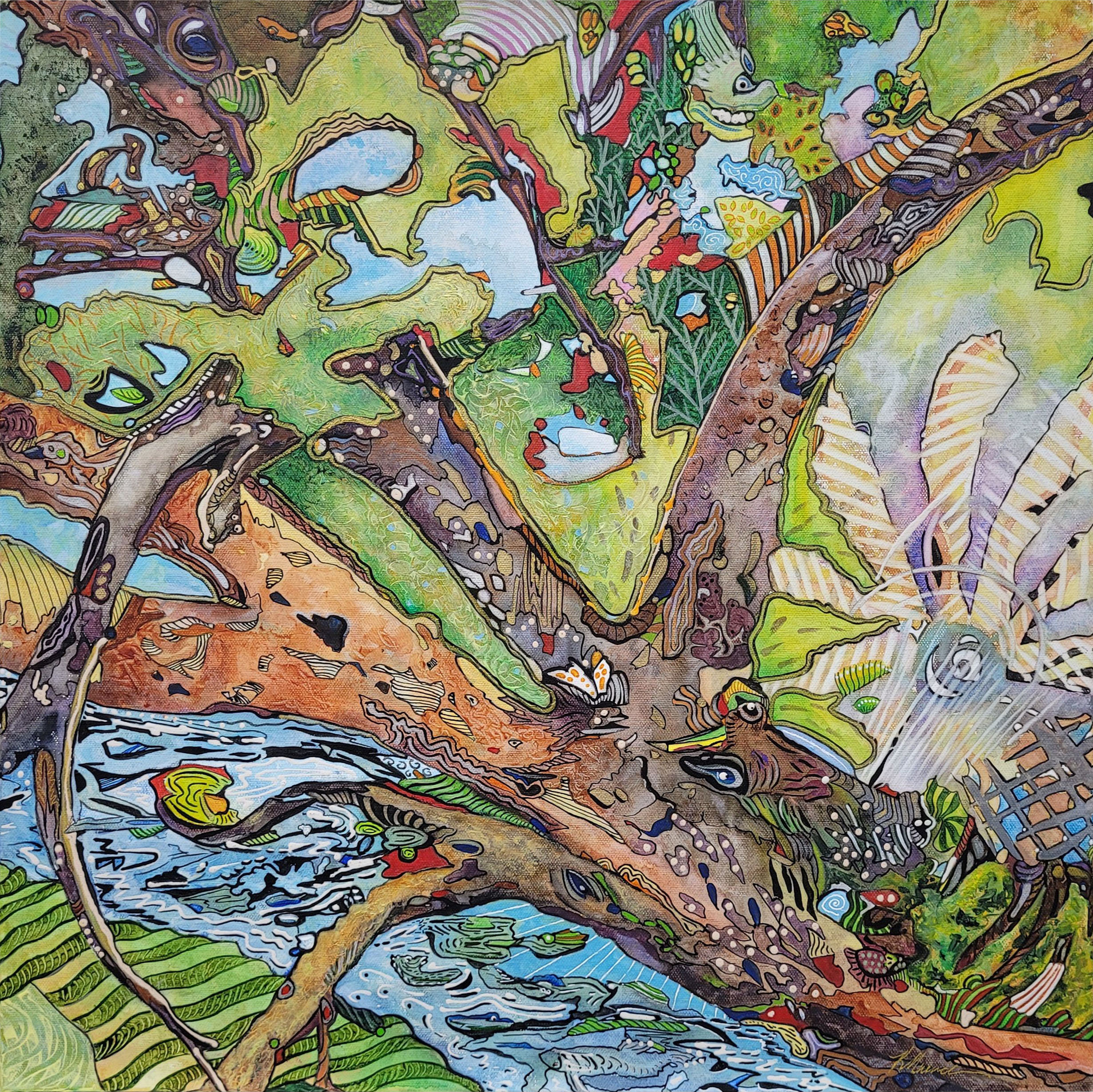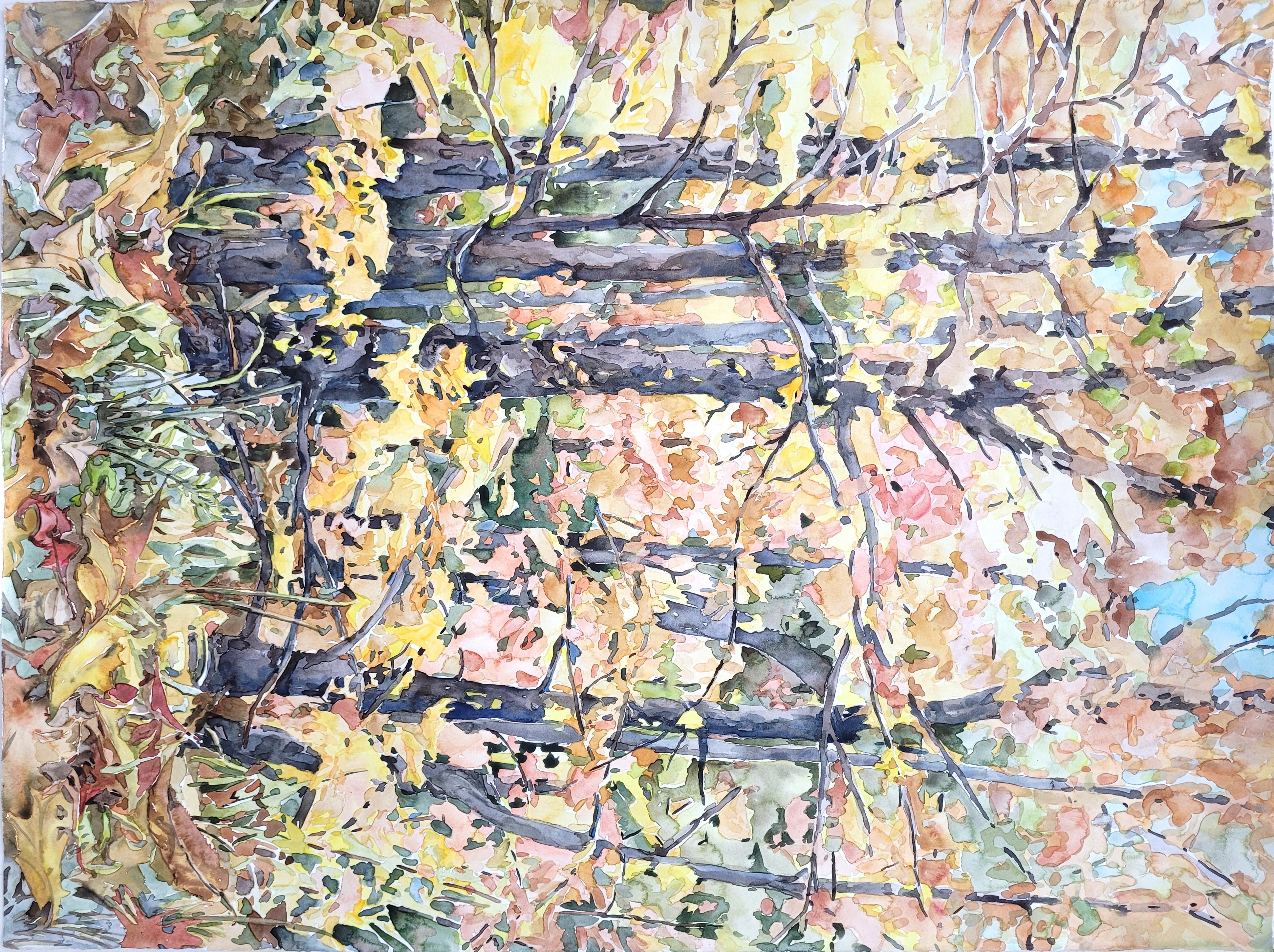 This most recent body of work connects the spontaneity of plein air watercolors to a deliberate expressionist construct that encourages viewing at both a comprehensive and intimate level; glimmering as the viewer shifts position. I use a language of mark-making and patterns to interpret the enigmas of our frenzied modern culture and our yearning for deep connection to our precious natural environment. It is the allure of nature’s beauty, intermingling with contemporary distracted life and the frolic of my mind, which guides my expressionism.